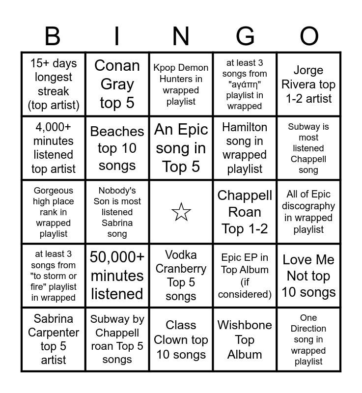 This bingo card has a free space and 24 words: 50,000+ minutes listened, Subway by Chappell roan Top 5 songs, An Epic song in Top 5, Sabrina Carpenter top 5 artist, Jorge Rivera top 1-2 artist, 15+ days longest streak (top artist), 4,000+ minutes listened top artist, Conan Gray top 5, Chappell Roan Top 1-2, Vodka Cranberry Top 5 songs, Hamilton song in wrapped playlist, Gorgeous high place rank in wrapped playlist, Epic EP in Top Album (if considered), Love Me Not top 10 songs, Beaches top 10 songs, Wishbone Top Album, All of Epic discography in wrapped playlist, Kpop Demon Hunters in wrapped playlist, Subway is most listened Chappell song, Nobody's Son is most listened Sabrina song, One Direction song in wrapped playlist, at least 3 songs from "to storm or fire" playlist in wrapped, at least 3 songs from "aγάπη" playlist in wrapped and Class Clown top 10 songs.