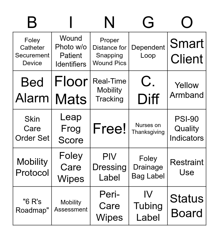This bingo card has a free space and 24 words: "6 R's Roadmap", Foley Care Wipes, Real-Time Mobility Tracking, IV Tubing Label, Smart Client, Foley Catheter Securement Device, Wound Photo w/o Patient Identifiers, Proper Distance for Snapping Wound Pics, Nurses on Thanksgiving, PSI-90 Quality Indicators, Skin Care Order Set, Floor Mats, Foley Drainage Bag Label, Restraint Use, Bed Alarm, Mobility Assessment, Peri-Care Wipes, Dependent Loop, Yellow Armband, Mobility Protocol, Leap Frog Score, PIV Dressing Label, C. Diff and Status Board.