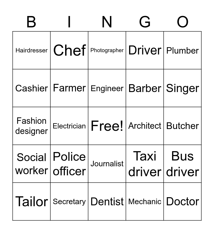 This bingo card has a free space and 50 words: Teacher, Doctor, Nurse, Dentist, Police officer, Firefighter, Chef, Waiter / Waitress, Cashier, Shop assistant, Farmer, Driver, Bus driver, Taxi driver, Pilot, Flight attendant, Engineer, Architect, Builder, Plumber, Electrician, Mechanic, Hairdresser, Barber, Artist, Musician, Singer, Actor / Actress, Photographer, Journalist, Writer, Lawyer, Judge, Accountant, Secretary, Receptionist, Scientist, Vet (Veterinarian), Baker, Butcher, Cleaner, Janitor, Security guard, Painter (house painter), Tailor, Fashion designer, Programmer, Web designer, Social worker and Tour guide.