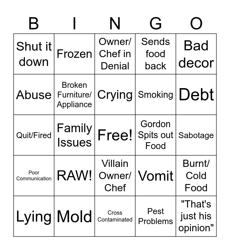 This bingo card has a free space and 24 words: RAW!, Mold, Crying, Lying, Bad decor, Shut it down, Abuse, Frozen, Gordon Spits out Food, Villain Owner/ Chef, Smoking, Quit/Fired, Vomit, Burnt/ Cold Food, Broken Furniture/ Appliance, Pest Problems, Sabotage, Owner/ Chef in Denial, Debt, Family Issues, "That's just his opinion", Poor Communication, Sends food back and Cross Contaminated.
