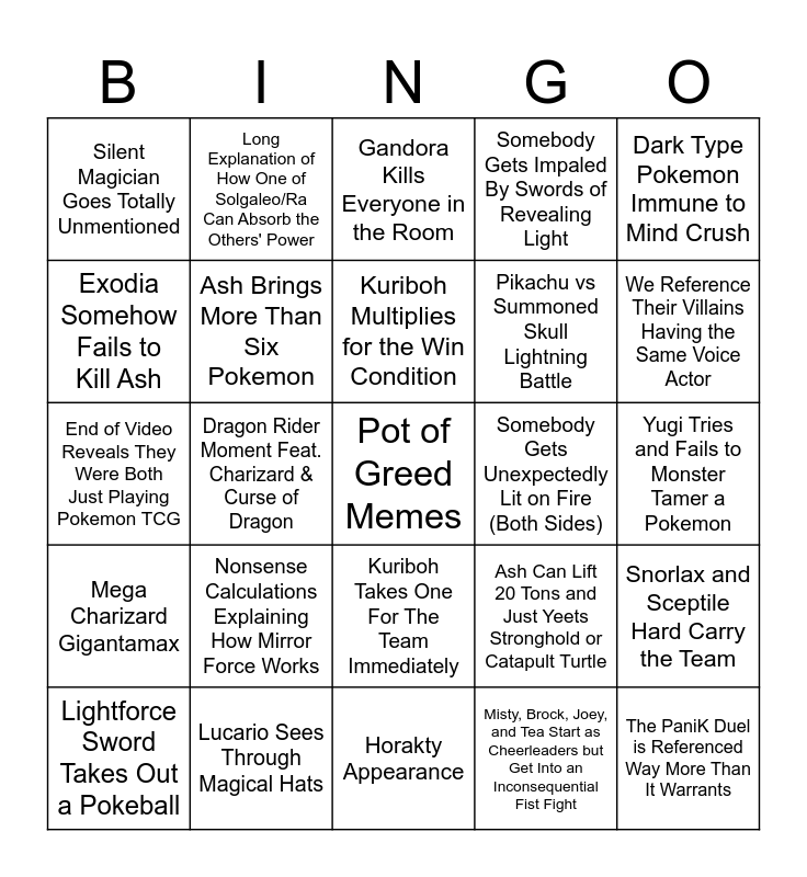 This bingo card has a free space and 24 words: Nonsense Calculations Explaining How Mirror Force Works, Lucario Sees Through Magical Hats, Kuriboh Multiplies for the Win Condition, Lightforce Sword Takes Out a Pokeball, Dark Type Pokemon Immune to Mind Crush, Silent Magician Goes Totally Unmentioned, Exodia Somehow Fails to Kill Ash, Long Explanation of How One of Solgaleo/Ra Can Absorb the Others' Power, Somebody Gets Unexpectedly Lit on Fire (Both Sides), Kuriboh Takes One For The Team Immediately, Pikachu vs Summoned Skull Lightning Battle, End of Video Reveals They Were Both Just Playing Pokemon TCG, Ash Can Lift 20 Tons and Just Yeets Stronghold or Catapult Turtle, Snorlax and Sceptile Hard Carry the Team, Ash Brings More Than Six Pokemon, Misty, Brock, Joey, and Tea Start as Cheerleaders but Get Into an Inconsequential Fist Fight, Yugi Tries and Fails to Monster Tamer a Pokemon, Gandora Kills Everyone in the Room, We Reference Their Villains Having the Same Voice Actor, Dragon Rider Moment Feat. Charizard & Curse of Dragon, The PaniK Duel is Referenced Way More Than It Warrants, Mega Charizard Gigantamax, Somebody Gets Impaled By Swords of Revealing Light and Horakty Appearance.