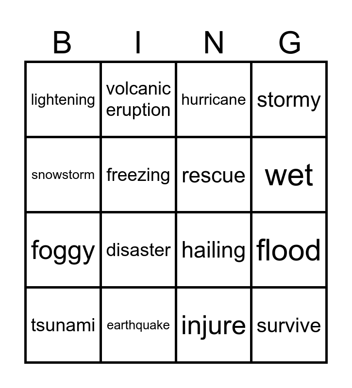 This bingo card has 20 words: flood, avalanche, hurricane, tornado, tsunami, snowstorm, earthquake, lightening, foggy, volcanic eruption, disaster, hailing, freezing, survive, rescue, rescuer, wet, stormy, injure and arrive.