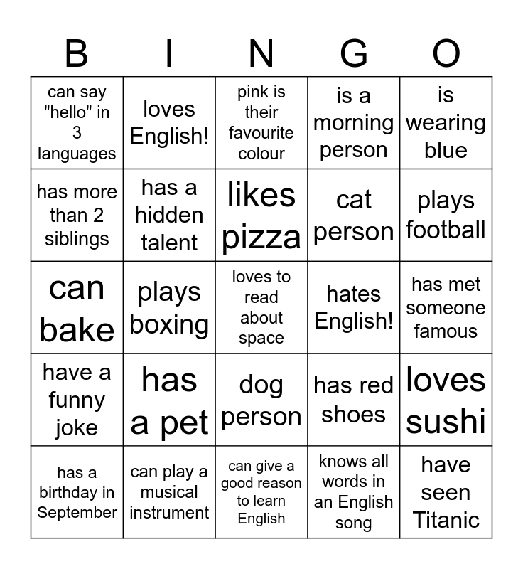 This bingo card has a free space and 24 words: has a pet, can play a musical instrument, likes pizza, has a birthday in September, is wearing blue, can say "hello" in 3 languages, has more than 2 siblings, loves English!, hates English!, dog person, cat person, can bake, has red shoes, loves sushi, has a hidden talent, knows all words in an English song, has met someone famous, pink is their favourite colour, plays football, plays boxing, have seen Titanic, have a funny joke, is a morning person and can give a good reason to learn English.