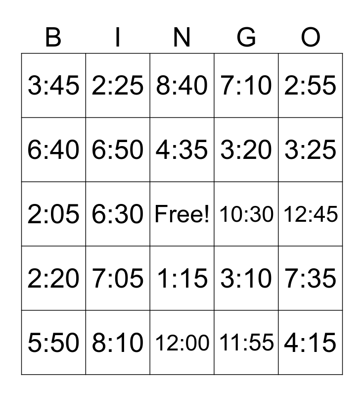 This bingo card has a free space and 24 words: 7:05, 8:10, 4:35, 5:50, 2:55, 3:45, 6:40, 2:25, 10:30, 1:15, 3:20, 2:05, 3:10, 7:35, 6:50, 11:55, 12:45, 8:40, 3:25, 6:30, 4:15, 2:20, 7:10 and 12:00.
