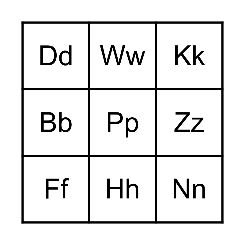 This bingo card has a free space and 8 words: Zz, Kk, Ww, Ff, Dd, Nn, Bb and Hh.