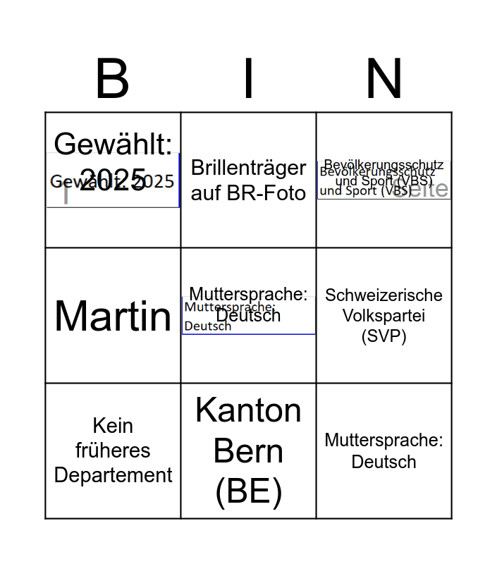 This bingo card has 6 images, a free space and 17 words: Kanton Zug (ZG), die Mitte, Bevölkerungsschutz und Sport (VBS), Gewählt: 2025, Brillenträger auf BR-Foto, Martin, Pfister, Kein früheres Departement, Kanton Bern (BE), Schweizerische Volkspartei (SVP), Verkehr, Energie und Kommunikation (UVEK), Gewählt: 2023, Muttersprache: Deutsch, Brillenträger auf BR-Foto, Albert, Rösti and Kein früheres Departement.