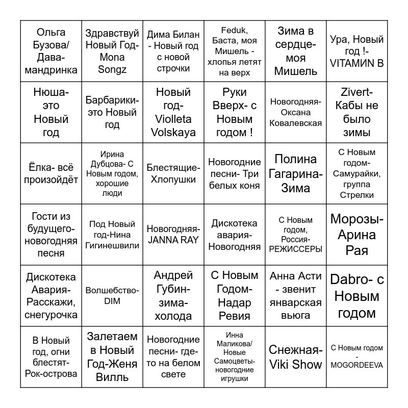 This bingo card has 36 words: С Новым Годом-Надар Ревия, Андрей Губин- зима-холода, Инна Маликова/ Новые Самоцветы- новогодние игрушки, Нюша- это Новый год, Гости из будущего- новогодняя песня, Новогодние песни- Три белых коня, Барбарики- это Новый год, Новогодние песни- где-то на белом свете, Зима в сердце- моя Мишель, Анна Асти - звенит январская вьюга, Zivert- Кабы не было зимы, Feduk, Баста, моя Мишель - хлопья летят на верх, Dabro- с Новым годом, Ирина Дубцова- С Новым годом, хорошие люди, Руки Вверх- с Новым годом !, Ольга Бузова/ Дава- мандринка, Дискотека Авария- Расскажи, снегурочка, Полина Гагарина- Зима, Ёлка- всё произойдёт, Дима Билан - Новый год с новой строчки, Блестящие- Хлопушки, Под Новый год-Нина Гигинешвили, Дискотека авария-Новогодняя, Новогодняя-JANNA RAY, С Новым годом, Россия- РЕЖИССЕРЫ, Здравствуй Новый Год-Mona Songz, Новогодняя-Оксана Ковалевская, Залетаем в Новый Год-Женя Вилль, Новый год-Violleta Volskaya, Ура, Новый год !- VITAMИN B, С Новым годом - MOGORDEEVA, В Новый год, огни блестят- Рок-острова, Морозы-Арина Рая, С Новым годом-Самурайки, группа Стрелки, Волшебство-DIM and Снежная-Viki Show.