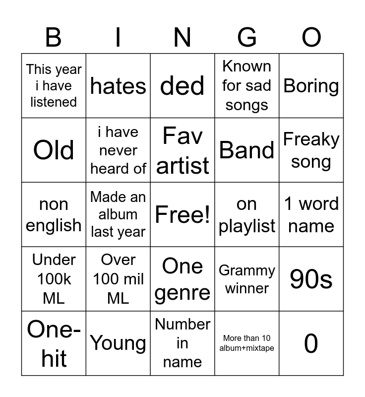 This bingo card has a free space and 24 words: One-hit, Over 100 mil ML, Fav artist, More than 10 album+mixtape, Boring, This year i have listened, hates, ded, on playlist, 1 word name, non english, i have never heard of, Grammy winner, 90s, Old, Young, Number in name, Known for sad songs, Freaky song, Under 100k ML, Made an album last year, One genre, Band and 0.
