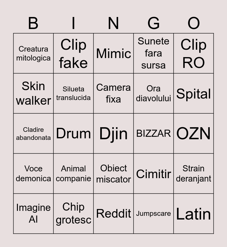 This bingo card has 25 words: Voce demonica, Chip grotesc, Djin, Jumpscare, Clip RO, Creatura mitologica, Clip fake, Mimic, BIZZAR, Strain deranjant, Skin walker, Silueta translucida, Reddit, Cimitir, Spital, Imagine AI, Drum, Camera fixa, Ora diavolului, OZN, Cladire abandonata, Animal companie, Obiect miscator, Sunete fara sursa and Latin.