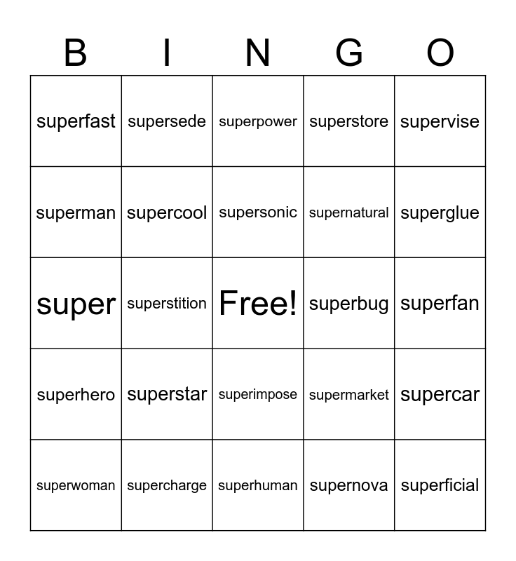 This bingo card has a free space and 24 words: superstar, supercharge, supersonic, superwoman, supervise, superfast, superman, supersede, superbug, superimpose, supernatural, super, supermarket, supercar, supercool, supernova, superfan, superpower, superglue, superstition, superficial, superhero, superstore and superhuman.