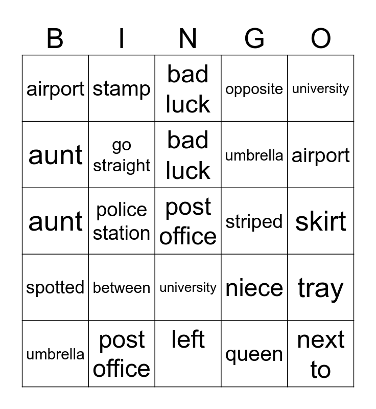 ⚠ This card has duplicate items: belt (2), next to (2), chemist's (2), between (2), grandmother (2), stamp (2), timetable (2), aunt (2), skirt (2), go straight (2), opposite (2), tray (2), niece (2), uncle (2), bad luck (2), striped (2), spotted (2), university (2), police station (2), queen (2), airport (2), umbrella (2)