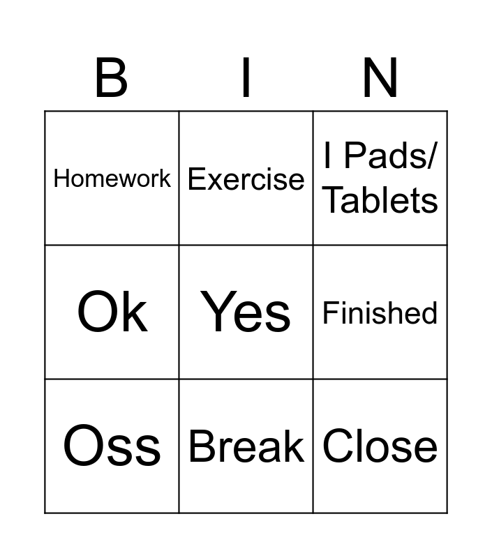 This bingo card has a free space and 8 words: Finished, I Pads/ Tablets, Exercise, Oss, Homework, Close, Ok and Break.