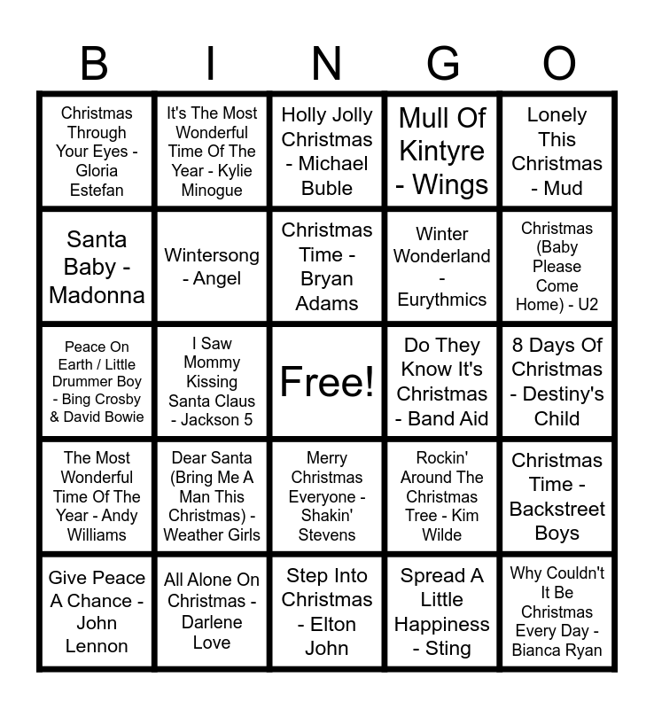 This bingo card has a free space and 96 words: All I Want For Christmas Is You - Mariah Carey, Last Christmas, Happy Xmas (War Is Over) - John Lennon, Do They Know It's Christmas - Band Aid, Driving Home For Christmas - Chris Rea, Wonderful Christmas Time - Paul Mccartney, 2000 Miles - Pretenders, Merry Christmas Everybody - Slade, Thank God It's Christmas - Queen, Please Come Home For Christmas - Eagles, Stop The Cavalry - Jona Lewie, Once Upon A Long Ago - Paul Mccartney, Christmas Lights - Coldplay, Christmas (Baby Please Come Home) - U2, Santa Claus Is Coming To Town - Bruce Springsteen, Santa Baby - Madonna, Christmas Time - Bryan Adams, Shake Up Christmas - Train, The Message Is Love - Arthur Baker And The Backbeat Disciples, Feliz Navidad - Jose Feliciano, We Are The World - Usa For Africa, It's Beginning To Look A Lot Like Christmas - Michael Buble, Fairytale Of New York - The Pogues, It's Gonna Be A Cold, Cold Christmas - Dana, Merry Christmas Everyone - Shakin' Stevens, Step Into Christmas - Elton John, White Christmas - Bing Crosby, Christmas Through Your Eyes - Gloria Estefan, Imagine - John Lennon, Underneath The Tree - Kelly Clarkson, Ding Dong - George Harrison, Rockin' Around The Christmas Tree - Kim Wilde, The Power Of Love - Frankie Goes To Hollywood, I Wish It Could Be Christmas Everyday - Leona Lewis, Lonely This Christmas - Mud, December Will Be Magic Again - Kate Bush, Christmas Time - Backstreet Boys, Christmas - Michael Buble, Put A Little Love In Your Heart - Annie Lennox & Al Green, I Saw Mommy Kissing Santa Claus - Jackson 5, Stay Another Day - East 17, Give Peace A Chance - John Lennon, Why Couldn't It Be Christmas Every Day - Bianca Ryan, All Alone On Christmas - Darlene Love, The Most Wonderful Time Of The Year - Andy Williams, Holly Jolly Christmas - Michael Buble, My Sweet Lord - George Harrison, I Wish Everyday Could Be Like Christmas - Bon Jovi, My Only Wish (This Year) - Britney Spears, Baby It's Cold Outside - Idina Menzel & Michael Buble, Merry Christmas Baby - Bruce Springsteen, Let It Snow - Michael Buble, Santa Tell Me - Ariana Grande, We All Stand Together - Paul Mccartney, Earth Song - Michael Jackson, 2000 Miles - Coldplay, Santa's Coming For Us - Sia, Rudolph The Red Nosed Reindeer - Dean Martin, When The Thames Froze - Smith & Burrows, Cold As Christmas - Elton John, Christmas (Baby Please Come Home) - Cher, Hallelujah - Pentatonix, A Winter's Tale - Queen, Santa Claus Is Coming To Town - Pointer Sisters, Wonderful Dream (Holidays Are Coming) - Melanie Thornton, Time For Change - Robbie Williams, Let It Go - Idina Menzel, It May Be Winter Outside - Love Unlimited, I Wish It Could Be Christmas Every Day - Wizzard, Spread A Little Happiness - Sting, Christmas Without You - Kenny Rogers & Dolly Parton, Cozy Little Christmas - Katy Perry, David's Song (Who'll Come With Me) - Kelly Family, Santa Claus Is Coming To Town - Mariah Carey, What The World Needs Now Is Love - Diana Ross And The Supremes, Have Yourself A Merry Little Christmas - Sam Smith, Sleigh Ride - The Ronettes, Wintersong - Angel, Mistletoe - Justin Bieber, Winter Wonderland - Eurythmics, Mull Of Kintyre - Wings, Rudolph The Red Nosed Reindeer - Temptations, What Christmas Means To Me - Ceelo Green, Someday At Christmas - Stevie Wonder, I'll Be Home On Christmas Day - Blue Blot, Peace On Earth / Little Drummer Boy - Bing Crosby & David Bowie, Dear Santa (Bring Me A Man This Christmas) - Weather Girls, White Christmas - George Ezra, When I Get Home For Christmas - Snow Patrol, 8 Days Of Christmas - Destiny's Child, Christmas Was A Friend Of Mine - Fay Lovsky, Sing-A-Longs - Mr Snowman, Sleigh Ride - Carpenters, Heal The World - Michael Jackson, It's The Most Wonderful Time Of The Year - Kylie Minogue and Santa Claus Is Coming To Town - Jackson 5.