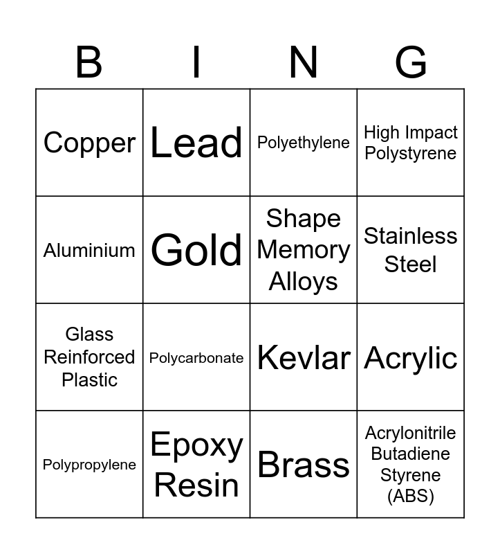 This bingo card has 26 words: Mild Steel, Tool Steel, Stainless Steel, Cast Iron, Aluminium, Copper, Gold, Lead, Brass, Carbon Fibre, Glass Reinforced Plastic, Kevlar, Engineered Timber, Reinforced Concrete, Acrylic, Nylon, High Impact Polystyrene, Acrylonitrile Butadiene Styrene (ABS), Polyethylene, Polypropylene, Polycarbonate, Urea Formaldehyde, Epoxy Resin, Melamine Formaldehyde, Shape Memory Alloys and D3O.