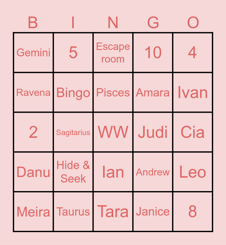This bingo card has 25 words: Hide & Seek, Tara, Pisces, Meira, 4, Gemini, Ravena, 5, Judi, Ian, Amara, 2, Andrew, Leo, Bingo, 8, Cia, Escape room, Ivan, Sagitarius, WW, Taurus, Danu, 10 and Janice.