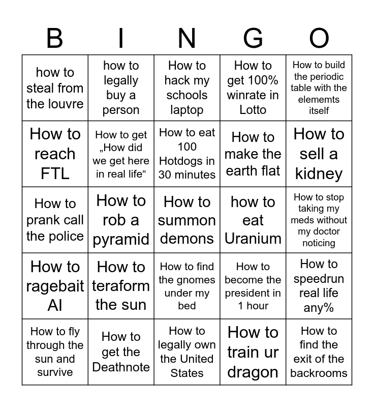 This bingo card has 25 words: How to teraform the sun, How to legally own the United States, How to eat 100 Hotdogs in 30 minutes, How to fly through the sun and survive, How to build the periodic table with the elememts itself, how to steal from the louvre, How to reach FTL, how to legally buy a person, how to eat Uranium, How to find the gnomes under my bed, How to make the earth flat, How to prank call the police, How to become the president in 1 hour, How to speedrun real life any%, How to get „How did we get here in real life“, How to find the exit of the backrooms, How to stop taking my meds without my doctor noticing, How to hack my schools laptop, How to sell a kidney, How to rob a pyramid, How to summon demons, How to get the Deathnote, How to ragebait AI, How to get 100% winrate in Lotto and How to train ur dragon.
