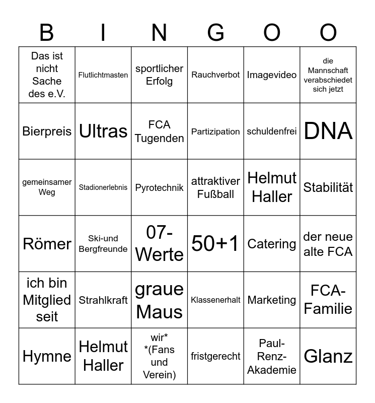 This bingo card has 36 words: Klassenerhalt, graue Maus, fristgerecht, Bierpreis, Römer, attraktiver Fußball, Ultras, wir* *(Fans und Verein), Imagevideo, Marketing, DNA, Rauchverbot, FCA-Familie, Stadionerlebnis, Partizipation, Das ist nicht Sache des e.V., ich bin Mitglied seit, Helmut Haller, gemeinsamer Weg, sportlicher Erfolg, Pyrotechnik, Ski-und Bergfreunde, 50+1, 07-Werte, Catering, Flutlichtmasten, schuldenfrei, Helmut Haller, FCA Tugenden, die Mannschaft verabschiedet sich jetzt, Glanz, Hymne, der neue alte FCA, Stabilität, Strahlkraft and Paul-Renz-Akademie.