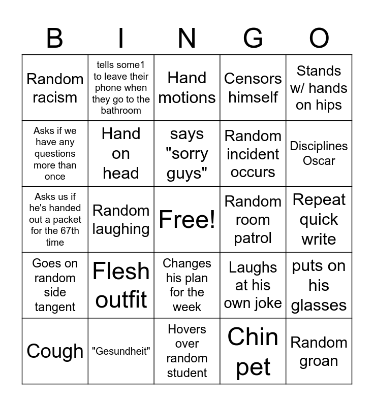 This bingo card has a free space and 29 words: Cough, Random singing, Random laughing, impulsive lecture, Random racism, Hand motions, Hand on head, Flesh outfit, Random room patrol, "Gesundheit", Repeat quick write, Random groan, Hovers over random student, Chin pet, Disciplines Oscar, Asks us to help w/ computer, Changes his plan for the week, Goes on random side tangent, Stands w/ hands on hips, Asks us if he's handed out a packet for the 67th time, Laughs at his own joke, Calls us "scholars", Random incident occurs, Asks if we have any questions more than once, Censors himself, tells some1 to leave their phone when they go to the bathroom, puts on his glasses, says "sorry guys" and millennial pause.