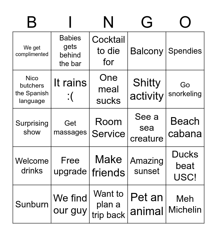 This bingo card has a free space and 24 words: Free upgrade, We find our guy, One meal sucks, Sunburn, Spendies, We get complimented, Nico butchers the Spanish language, Babies gets behind the bar, See a sea creature, Make friends, Shitty activity, Surprising show, Amazing sunset, Ducks beat USC!, It rains :(, Pet an animal, Beach cabana, Cocktail to die for, Go snorkeling, Get massages, Meh Michelin, Welcome drinks, Balcony and Want to plan a trip back.