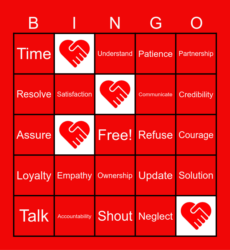 This bingo card has 7 images, a free space and 35 words: Policy, Assure, Accountability, Fun, Patience, Courage, Resolve, Empathy, Update, Credibility, Talk, Rude, Trust, Refuse, Listen, Time, Satisfaction, Ownership, Retention, Partnership, Argue, Commitment, Understand, Align, Avoid, Loyalty, Engagement, Communicate, Solution, Customer, Freedom, Shout, Neglect, Harsh and Absence.