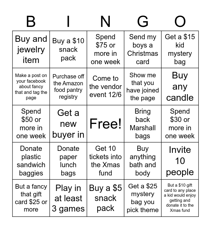 This bingo card has a free space and 24 words: Donate paper lunch bags, Play in at least 3 games, Come to the vendor event 12/6, But a fancy that gift card $25 or more, Get a $15 kid mystery bag, Buy and jewelry item, Make a post on your facebook about fancy that and tag the page, Buy a $10 snack pack, Bring back Marshall bags, Get 10 tickets into the Xmas fund, Show me that you have joined the page, Spend $50 or more in one week, Buy anything bath and body, Invite 10 people, Purchase off the Amazon food pantry registry, Get a $25 mystery bag you pick theme, Spend $30 or more in one week, Spend $75 or more in one week, Buy any candle, Get a new buyer in, But a $10 gift card to any place a kid would enjoy getting and donate it to the Xmas fund, Donate plastic sandwich baggies, Send my boys a Christmas card and Buy a $5 snack pack.