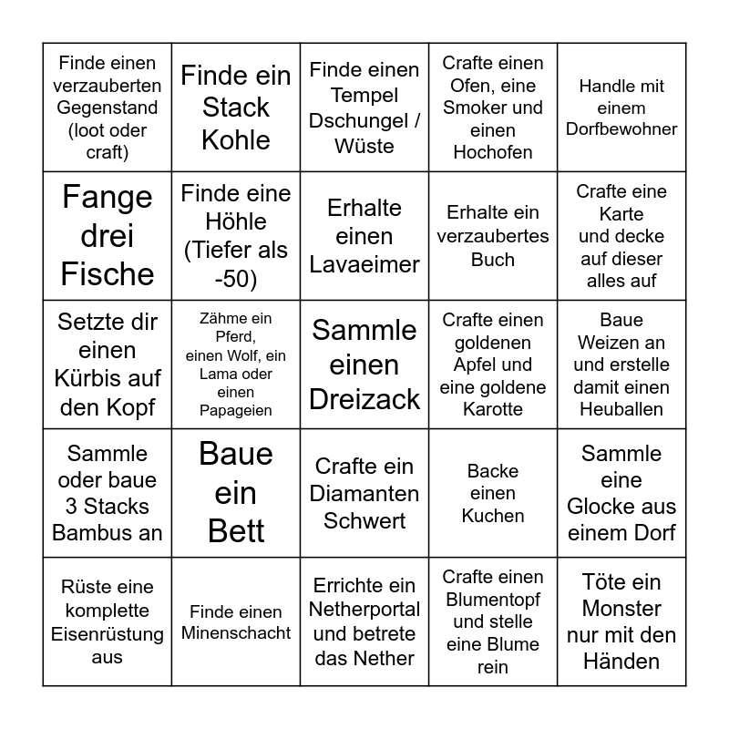This bingo card has 25 words: Baue ein Bett, Errichte ein Netherportal und betrete das Nether, Erhalte einen Lavaeimer, Rüste eine komplette Eisenrüstung aus, Handle mit einem Dorfbewohner, Finde einen verzauberten Gegenstand (loot oder craft), Fange drei Fische, Finde ein Stack Kohle, Crafte einen goldenen Apfel und eine goldene Karotte, Crafte ein Diamanten Schwert, Erhalte ein verzaubertes Buch, Setzte dir einen Kürbis auf den Kopf, Backe einen Kuchen, Sammle eine Glocke aus einem Dorf, Finde eine Höhle (Tiefer als -50), Töte ein Monster nur mit den Händen, Baue Weizen an und erstelle damit einen Heuballen, Finde einen Tempel Dschungel / Wüste, Crafte eine Karte und decke auf dieser alles auf, Zähme ein Pferd, einen Wolf, ein Lama oder einen Papageien, Sammle einen Dreizack, Finde einen Minenschacht, Sammle oder baue 3 Stacks Bambus an, Crafte einen Ofen, eine Smoker und einen Hochofen and Crafte einen Blumentopf und stelle eine Blume rein.