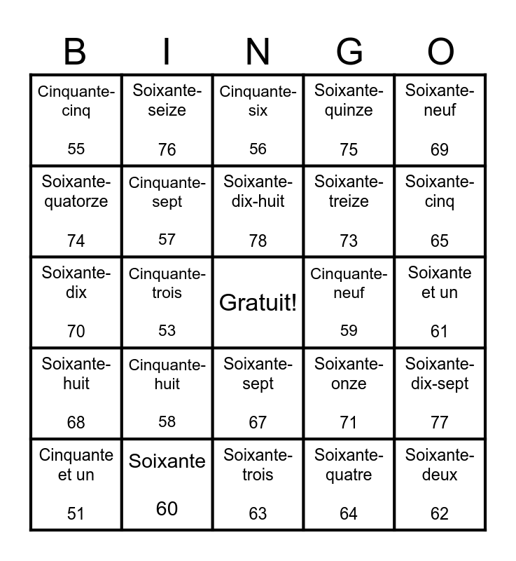 This bingo card has a free space and 29 words: Cinquante et un 51, Cinquante-deux 52, Cinquante-trois 53, Cinquante-quatre 54, Cinquante-cinq 55, Cinquante-six 56, Cinquante-sept 57, Cinquante-huit 58, Cinquante- neuf 59, Soixante 60, Soixante et un 61, Soixante-deux 62, Soixante-trois 63, Soixante-quatre 64, Soixante-cinq 65, Soixante-six 66, Soixante-sept 67, Soixante-huit 68, Soixante-neuf 69, Soixante-dix 70, Soixante-onze 71, Soixante-douze 72, Soixante-treize 73, Soixante-quatorze 74, Soixante-quinze 75, Soixante-seize 76, Soixante-dix-sept 77, Soixante-dix-huit 78 and Soixante-dix-neuf 79.