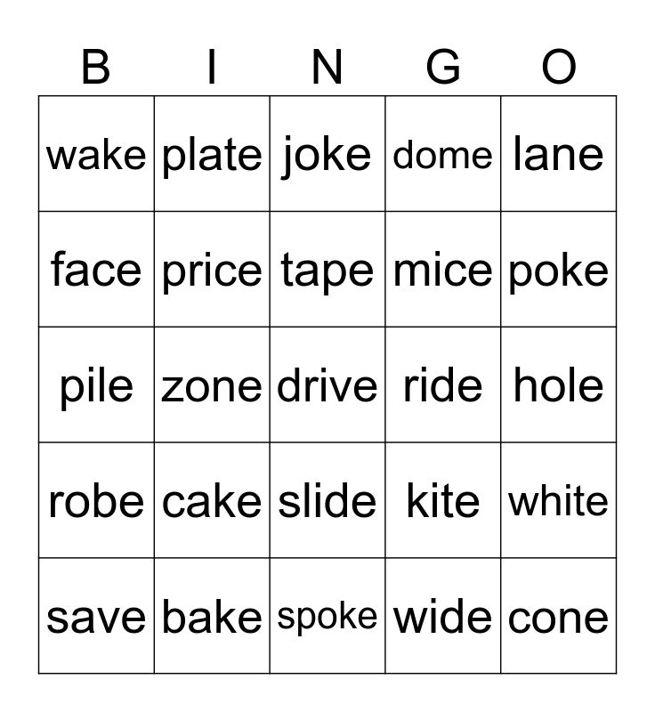 This bingo card has a free space and 24 words: cake, bake, tape, save, lane, wake, face, plate, ride, slide, mice, pile, kite, white, price, wide, hole, joke, poke, zone, cone, robe, dome and spoke.