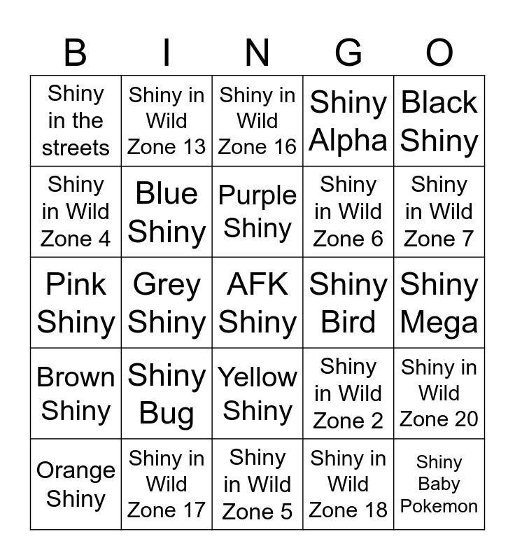 This bingo card has a free space and 39 words: Pink Shiny, Red Shiny, Green Shiny, Blue Shiny, Orange Shiny, Yellow Shiny, Purple Shiny, White Shiny, Black Shiny, Brown Shiny, Grey Shiny, Shiny Alpha, Shiny Baby Pokemon, Shiny Mega, Shiny Bird, Shiny Bug, Shiny on a roof, Shiny in the streets, Shiny in Wild Zone 1, Shiny in Wild Zone 2, Shiny in Wild Zone 4, Shiny in Wild Zone 5, Shiny in Wild Zone 6, Shiny in Wild Zone 7, Shiny in Wild Zone 8, Shiny in Wild Zone 9, Shiny in Wild Zone 10, Shiny in Wild Zone 11, Shiny in Wild Zone 12, Shiny in Wild Zone 13, Shiny in Wild Zone 14, Shiny in Wild Zone 15, Shiny in Wild Zone 16, Shiny in Wild Zone 17, Shiny in Wild Zone 18, Shiny in Wild Zone 19, Shiny in Wild Zone 20, Pink Shiny and Pink Shiny.