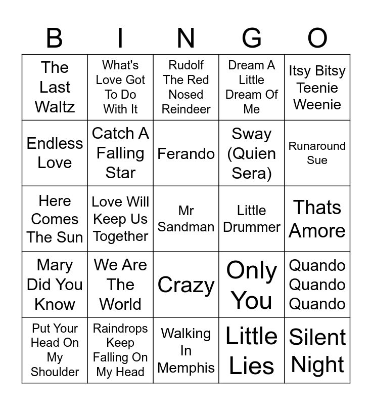 This bingo card has 35 words: All By Myself, Away In A Manger, Believe, Catch A Falling Star, Crazy, Dream A Little Dream Of Me, Endless Love, Everyday, Ferando, Go Tell It On The Mountain, Here Comes The Sun, Itsy Bitsy Teenie Weenie, Jingle Jangle, Last Christmas, The Last Waltz, Little Drummer, Little Lies, Love Will Keep Us Together, Mary Did You Know, Mr Sandman, Only You, Put Your Head On My Shoulder, Quando Quando Quando, Raindrops Keep Falling On My Head, Rudolf The Red Nosed Reindeer, Runaround Sue, Silent Night, Song Sung Blue, Sway (Quien Sera), Thats Amore, Up Where We Belong, Walking In Memphis, We Are The World, What's Love Got To Do With It and Winter Wonderland.