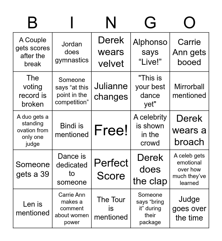 This bingo card has a free space and 54 words: Derek says "my man", Someone gets a 39, Someone cries, Carrie Ann says "butttt", Perfect Score, Julianne says something unhinged, Alphonso says “Live!”, Derek says "I see you", The voting record is broken, Derek peeks out, A Couple gets scores after the break, Derek says “Listen!”, Carrie Ann makes a comment about women power, Len is mentioned, Robert says “Crikey, The Tour is mentioned, Judge goes over the time, "This is your best dance yet", Bruno stands, Derek wears a broach, Derek does the clap, A judge demonstrates a move, A celebrity is shown in the crowd, Carrie Ann gets booed, Someone cries over Robert’s dance, Jordan does gymnastics, Carrie Ann or Bruno dances, Derek gets cut off/ rushed, Zac Efron is mentioned, Someone says “bring it” during their package, Bruno’s shirt is see through, Surprise visit in practice, Carrie Ann wears gold or sequins, Julianne flubs her words, Derek wears velvet, A judge uses the word iconic, A duo gets a standing ovation from only one judge, A celeb gets emotional over how much they’ve learned, 2 or more couples have the same score, Someone says “at this point in the competition”, Andy is in the audience, A celeb says “I just want to show America what I can do”, A judge says “you owned that stage tonight”, Mandy Moore choreographs a dance., Dance is dedicated to someone, Chemistry, Clothing is removed, Pair makes mistake, Julianne changes, Bindi is mentioned, Mirrorball mentioned, Choreo is mentioned, Hug/Kisses in Skybox and Jump over partner.