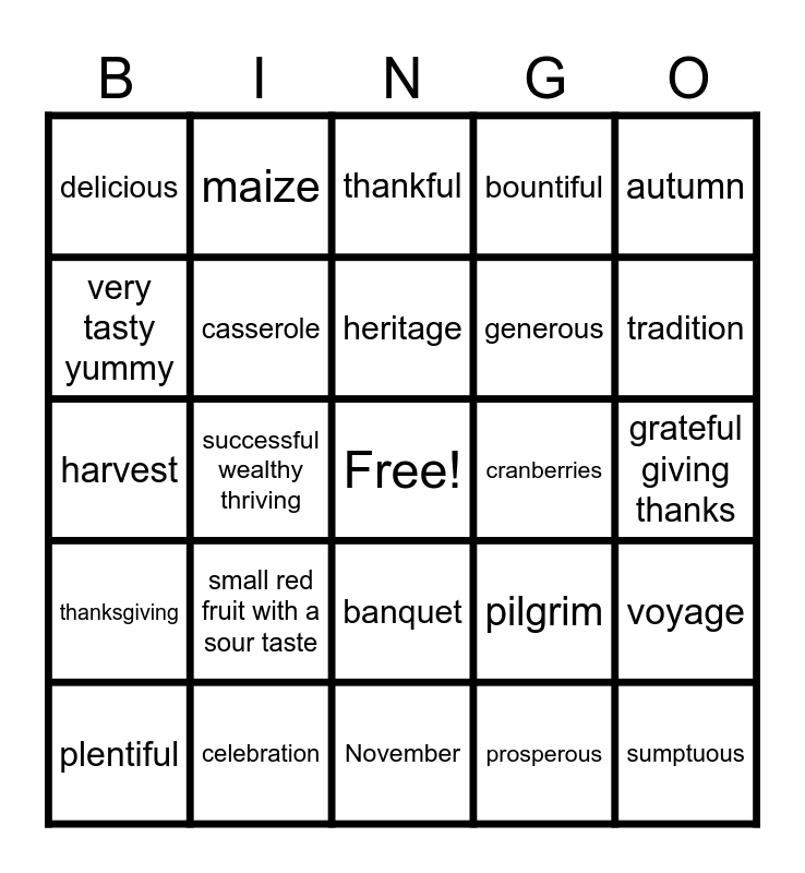 This bingo card has a free space and 24 words: small red fruit with a sour taste, celebration, heritage, plentiful, autumn, delicious, very tasty yummy, maize, cranberries, banquet, generous, harvest, pilgrim, voyage, casserole, prosperous, grateful giving thanks, thankful, tradition, successful wealthy thriving, sumptuous, thanksgiving, bountiful and November.