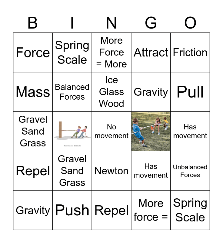 This bingo card has 3 images, a free space and 35 words: Force, Pull, Push, Balanced Forces, Unbalanced Forces, Gravel Sand Grass, Ice Glass Wood, Friction, Gravity, Attract, Spring Scale, Has movement, Mass, Repel, Speed, More Force = More, Newtons, Force, Push, Pull, Gravity, Attract, Repel, Friction, Mass, Speed, Balanced Force, Unbalanced Force, Newton, More force =, Spring Scale, No Movement, Has movement, Gravel Sand Grass and Ice Tile Wood.