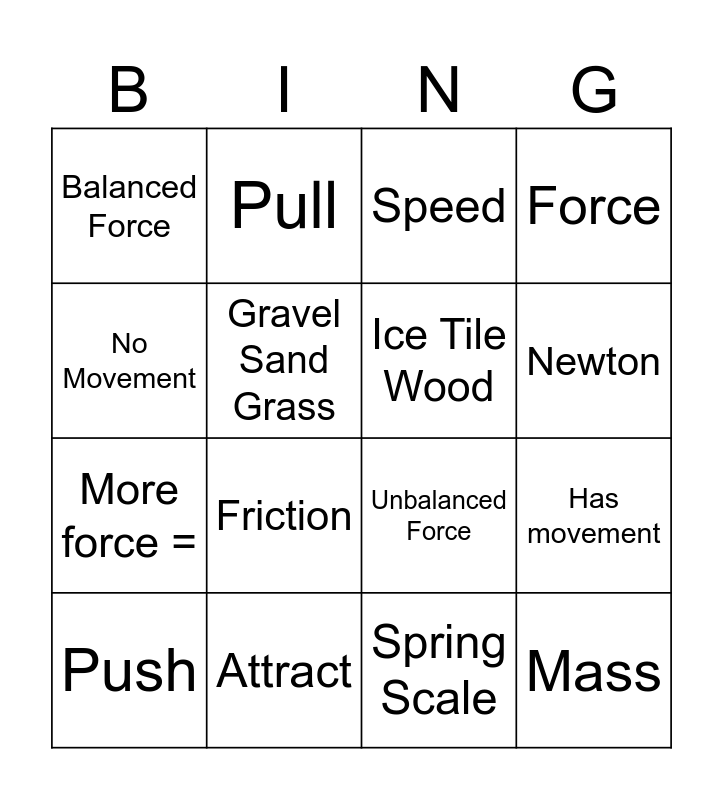 This bingo card has 18 words: Friction, Mass, Speed, Balanced Force, Unbalanced Force, Force, Push, Pull, Newton, More force =, Spring Scale, No Movement, Has movement, Gravel Sand Grass, Ice Tile Wood, Gravity, Attract and Repel.