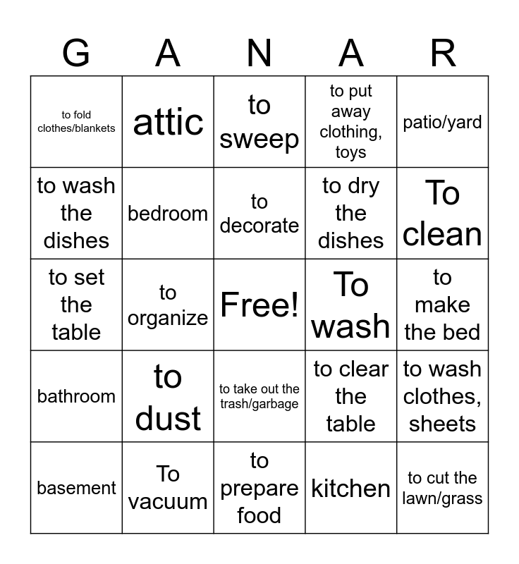 This bingo card has a free space and 34 words: living room, kitchen, dining room, staircase/stairs, bathroom, bedroom, patio/yard, basement, attic, to tidy up/fix/neaten, to decorate, to sweep, to hang clothes, To feed (pets), To wash, To clean, To vacuum, to set the table, to dust, to clear the table, to take out the trash/garbage, to work in the garden, to fold clothes/blankets, to make the bed, to prepare food, to cut the lawn/grass, to put away clothing, toys, to water the plants, to dry the dishes, to wash the dishes, to iron clothes, to organize, to wash clothes, sheets and to dry clothes.