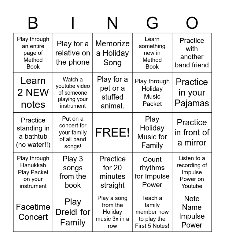 This bingo card has a free space and 24 words: Play 3 songs from the book, Play Dreidl for Family, Play for a pet or a stuffed animal., Facetime Concert, Practice with another band friend, Play through an entire page of Method Book, Learn 2 NEW notes, Play for a relative on the phone, Play Holiday Music for Family, Practice for 20 minutes straight, Play through Holiday Music Packet, Practice standing in a bathtub (no water!!), Count rhythms for Impulse Power, Listen to a recording of Impulse Power on Youtube, Watch a youtube video of someone playing your instrument, Teach a family member how to play the First 5 Notes!, Practice in front of a mirror, Memorize a Holiday Song, Practice in your Pajamas, Put on a concert for your family of all band songs!, Note Name Impulse Power, Play through Hanukkah Play Packet on your instrument, Learn something new in Method Book and Play a song from the Holiday music 3x in a row.