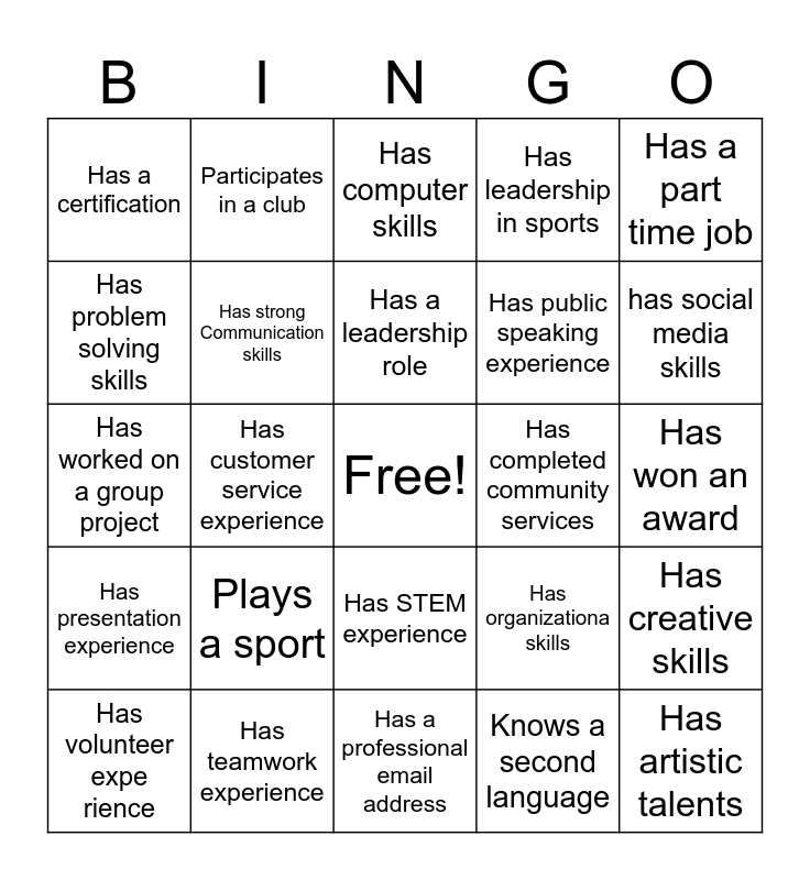 This bingo card has a free space and 24 words: Has volunteer expe rience, Plays a sport, Has a leadership role, Knows a second language, Has a part time job, Has a certification, Participates in a club, Has computer skills, Has completed community services, Has won an award, Has worked on a group project, Has strong Communication skills, Has organizationa skills, Has creative skills, Has problem solving skills, Has teamwork experience, Has a professional email address, Has leadership in sports, has social media skills, Has presentation experience, Has customer service experience, Has STEM experience, Has public speaking experience and Has artistic talents.
