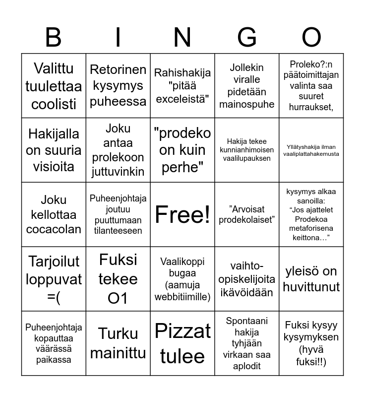 This bingo card has a free space and 44 words: Joku pelaa sikapeliä, Fuksi kysyy kysymyksen (hyvä fuksi!!), Prodekon arvot, Puheenjohtaja kopauttaa väärässä paikassa, Prodeko-merch hakijalla, Spontaani hakija tyhjään virkaan saa aplodit, Rahishakija "pitää exceleistä", Joku hakee toiseen (tai kolmanteen) hallitusvirkaan! (go joku!!! powermove!), Proleko?:n päätoimittajan valinta saa suuret hurraukset,, Turku mainittu, Jollekin viralle pidetään mainospuhe, ”Arvoisat prodekolaiset”, Vaalikoppi bugaa (aamuja webbitiimille), Fuksi tekee O1, Riimi kysymyksessä, Pizzat tulee, Puheenjohtaja kertoo tarpeesta ”vauhdittaa kokousta”, Joku kellottaa cocacolan, Kolme pointtia, Yllätyshakija ilman vaaliplattahakemusta, Retorinen kysymys puheessa, Hakija tekee akrobaattisen liikkeen, Joku räppää vaalihakemuksensa, Valittu tuulettaa coolisti, Sikatiimi mainitaan, kysymys alkaa sanoilla: “Jos ajattelet Prodekoa metaforisena keittona…”, Athene mainitaan, Joku puhuu murteella, vaihto-opiskelijoita ikävöidään, Tarjoilut loppuvat =(, Pora mainitaan, yleisö on huvittunut, yllättävä juonteenkäänne, maitotytön nimi ei nouse keskusteluuun eikä sitä vaihdeta., Puheenjohtaja joutuu puuttumaan tilanteeseen, joku tekee kandia, joku ännä mouhoaa, Goofy alias kuulutetaan, "prodeko on kuin perhe", Hakijalla on suuria visioita, Hakija tekee kunnianhimoisen vaalilupauksen, Metafora puheessa, Joku antaa prolekoon juttuvinkin and Mainostauko.