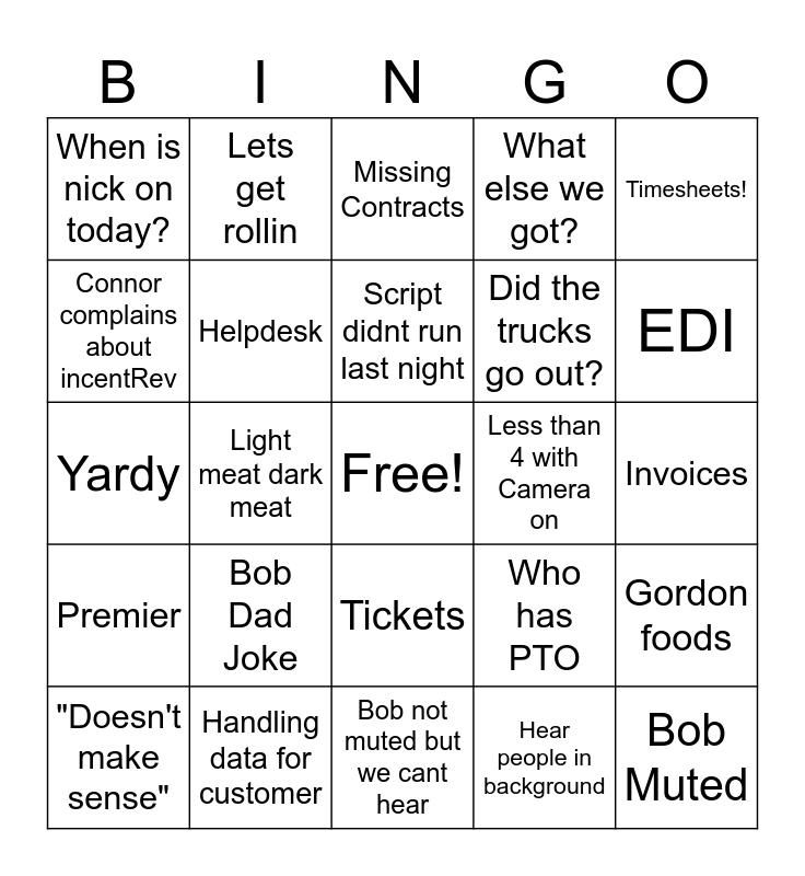 This bingo card has a free space and 52 words: Weather Chat, Bob Muted, Marshall Muted, Bob not muted but we cant hear, Bob Dad Joke, Alrighty Then, Lets get rollin, Chicken Problem, Connor complains about incentRev, Call us if you need us, Helpdesk, USDA, Gordon foods, Who has PTO, Tom story, Party Planning Committee, Script didnt run last night, Less than 4 with Camera on, More than 4 with Camera on, Timesheets!, Light meat dark meat, Hear people in background, When is nick on today?, Did the trucks go out?, "XX stay on after this call", Astronomy / Pictures, Audio Issues, Customer being crazy, EDI, Hop on another call, Somebody eating, What else we got?, Marshall security update, Anything else?, incentRev deals run ok?, Missing Contracts, Handling data for customer, Ill forward you that email, Merge Request, We're in testing, Distributor, Invoices, Premier, Blackbaud, Tickets, Snellgrove, We're waiting on them, Yardy, Widget, Waiting on the data to load, "Doesn't make sense" and Schedule a meeting.