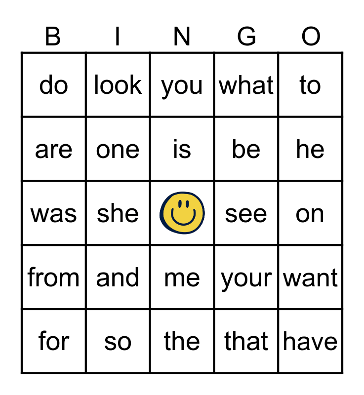 This bingo card has a free space and 25 words: and, the, is, for, to, do, are, look, see, me, be, was, your, want, one, in, on, you, he, she, have, so, from, what and that.