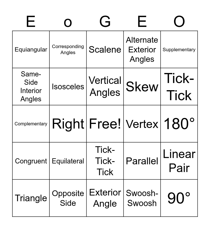 This bingo card has a free space and 29 words: Triangle, Acute, Right, Obtuse, Equiangular, Scalene, Isosceles, Equilateral, Vertex, Opposite Side, 180°, 90°, Exterior Angle, Swoosh-Swoosh, Tick-Tick, Swoosh-Swoosh-Swoosh, Tick-Tick-Tick, Congruent, Supplementary, Complementary, Parallel, Perpendicular, Skew, Same-Side Interior Angles, Alternate Exterior Angles, Corresponding Angles, Linear Pair, Vertical Angles and Translation.