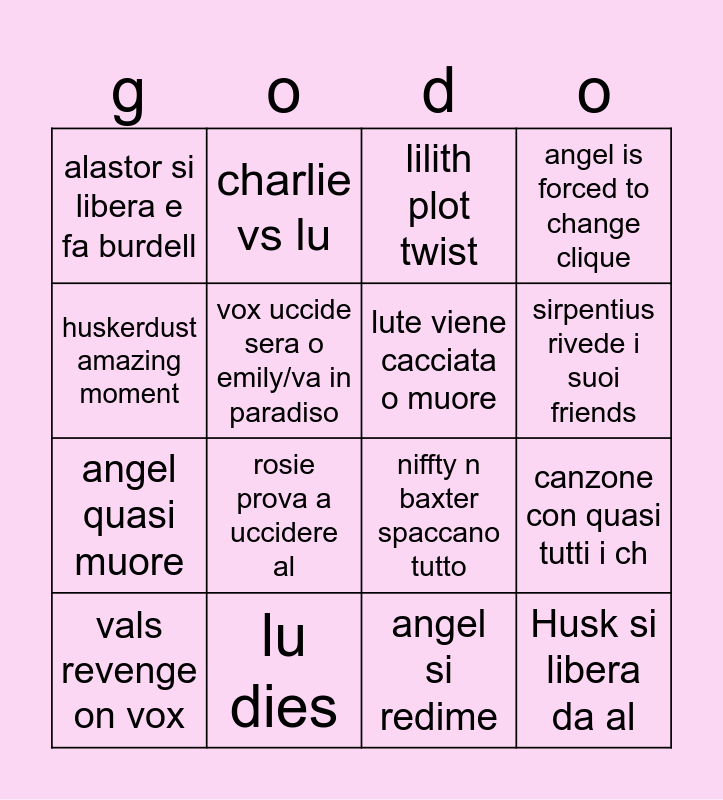 This bingo card has 16 words: vals revenge on vox, lu dies, lilith plot twist, angel is forced to change clique, huskerdust amazing moment, charlie vs lu, niffty n baxter spaccano tutto, canzone con quasi tutti i ch, alastor si libera e fa burdell, vox uccide sera o emily/va in paradiso, angel si redime, sirpentius rivede i suoi friends, angel quasi muore, rosie prova a uccidere al, lute viene cacciata o muore and Husk si libera da al.