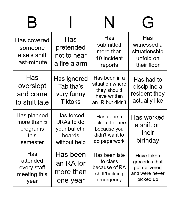 This bingo card has 16 words: Has been an RA for more than one year, Has worked a shift on their birthday, Has submitted more than 10 incident reports, Has covered someone else’s shift last-minute, Has planned more than 5 programs this semester, Has pretended not to hear a fire alarm, Has done a lockout for free because you didn't want to do paperwork, Has been late to class because of RA shift/building emergency, Has overslept and come to shift late, Has ignored Tabitha’s very funny Tiktoks, Has attended every staff meeting this year, Has witnessed a situationship unfold on their floor, Has forced JRAs to do your bulletin boards without help, Has had to discipline a resident they actually like, Has been in a situation where they should have written an IR but didn’t and Have taken groceries that got delivered and were never picked up.