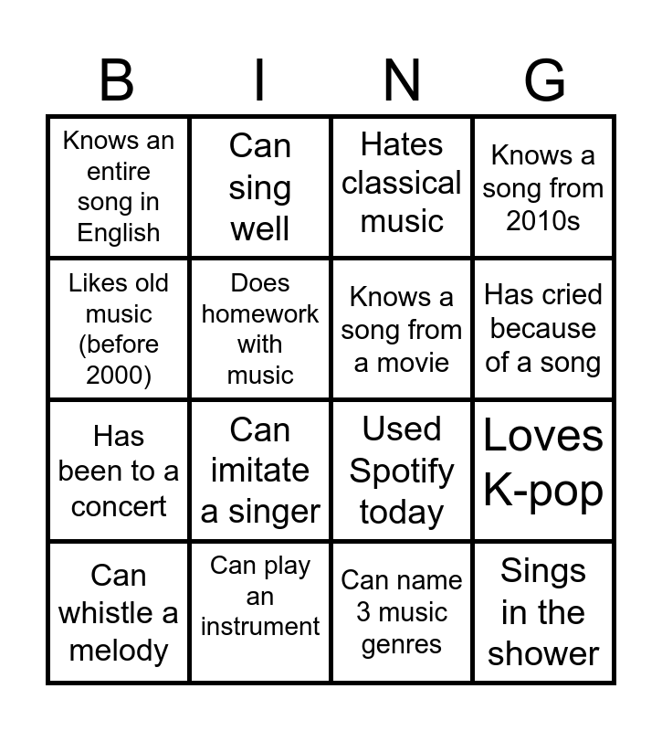 This bingo card has 16 words: Can play an instrument, Loves K-pop, Hates classical music, Knows an entire song in English, Has been to a concert, Can sing well, Used Spotify today, Can name 3 music genres, Likes old music (before 2000), Does homework with music, Can whistle a melody, Knows a song from 2010s, Can imitate a singer, Has cried because of a song, Knows a song from a movie and Sings in the shower.