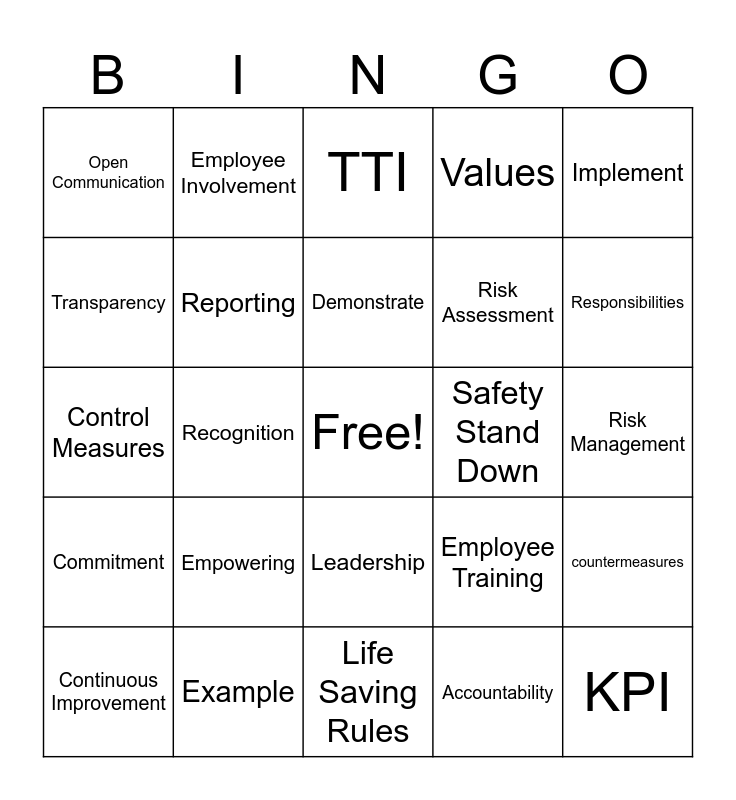This bingo card has a free space and 26 words: Leadership, Accountability, Demonstrate, Example, Implement, Open Communication, Transparency, Employee Involvement, Risk Management, Employee Training, Risk Assessment, Control Measures, countermeasures, Continuous Improvement, Recognition, Awards, Values, Commitment, TTI, KPI, Responsibilities, Life Saving Rules, Safety Stand Down, Empowering, Reporting and Concerns.