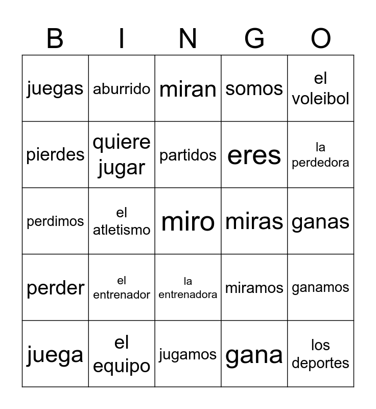 This bingo card has 55 words: el boliche/ los bolos, juega, juego, juegas, jugamos, juegan, quiere jugar, soy, eres, es, somos, son, el béisbol, el básquetbol, el fútbol americano, el fútbol, el voleibol, el atletismo, la lucha libre, miro, miras, mira, miramos, miran, mirar, partidos, gana, gano, ganas, ganamos, ganar, ganan, pierde, pierdo, pierdes, perdimos, pierden, perder, los deportes, divertido, aburrido, terrible, talentoso, atlético, el entrenador, el equipo, el ganador, el perdedor, el campeón, la perdedora, quiere jugar al..., la pista y campo, el baloncesto, la entrenadora and la campeona.