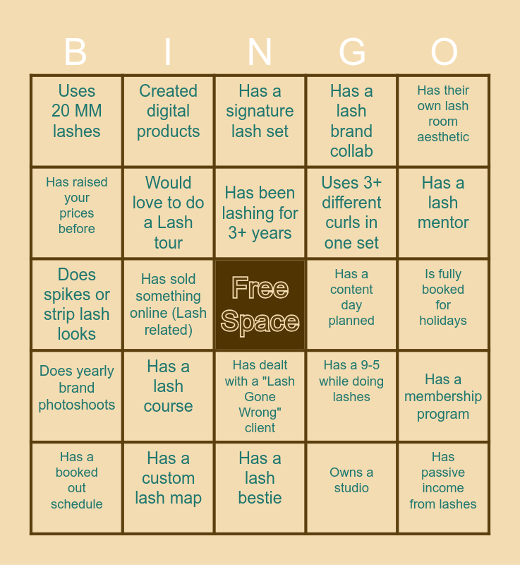 This bingo card has a free space and 24 words: Has a booked out schedule, Has a lash course, Has been lashing for 3+ years, Owns a studio, Has their own lash room aesthetic, Uses 20 MM lashes, Created digital products, Has a signature lash set, Has a content day planned, Is fully booked for holidays, Does spikes or strip lash looks, Would love to do a Lash tour, Has a 9-5 while doing lashes, Has a membership program, Has raised your prices before, Has a custom lash map, Has a lash bestie, Has a lash brand collab, Has a lash mentor, Does yearly brand photoshoots, Has sold something online (Lash related), Has dealt with a "Lash Gone Wrong" client, Uses 3+ different curls in one set and Has passive income from lashes.