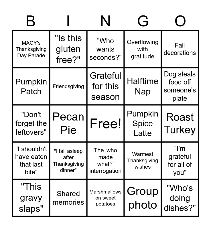 This bingo card has a free space and 84 words: Thanksgiving Dinner, Mounds of pumpkins, "Who wants seconds?", "May your heart be as full as your plate", "I'm only having one plate", Cozy era, A season of connection and community, "I'm so grateful", "Save room for dessert", "Pass the rolls!", Potluck-style feast, "Needs more butter", Friendsgiving, Pumpkin Spice Latte, Turkey Trot, MACY's Thanksgiving Day Parade, "This gravy slaps", Pumpkin Patch, Thankful for today, The beauty of coming together, Bless the food, Halftime Nap, "Who's doing dishes?", Food coma activated, Pecan Pie, Fall Festival, A Charlie Brown Thanksgiving, Thankful for family, "Cranberries, yuck!", "I love Pumpkin Pie", "I fall asleep after Thanksgiving dinner", Break the wishbone, Eats something other than turkey on Thanksgiving, "Don't forget the leftovers", "Is the game on?", secret ingredient is "love", Marshmallows on sweet potatoes, A dish no one recognizes, Dog steals food off someone's plate, "I shouldn't have eaten that last bite", "Holiday calories don't count", "Is the oven still on?", An extra slice of pie, "Just want a small taste", "Too full to walk", "Mashed potato mountain", "Is this gluten free?", Sweatpants attire, "I'm stuffed", Blessings all around, "Gratitude makes everything richer", Warmest Thanksgiving wishes, Overflowing with gratitude, A table filled with joy, Green Bean Casserole, Harvest Season, Shared memories, Grateful for this season, "Watch Football", Roast Turkey, Family gatherings, Togetherness and warmth, Give Thanks!, Corn Niblets, Homemade Stuffing, Gobble like a Turkey, Pumpkin Pie, Extended family celebrations, Fall decorations, Turkey!, "I'm grateful for all of you", "Good health and good pie", "A toast to family", "This is my favorite holiday", The 'who made what?' interrogation, Group photo, Cinnamon scented everything, "Perfect fall weather", Sweater Weather, Store bought dessert, Harvest of gratitude, Home Heart Harvest, Blessed beyond measure and Autumn blessings.