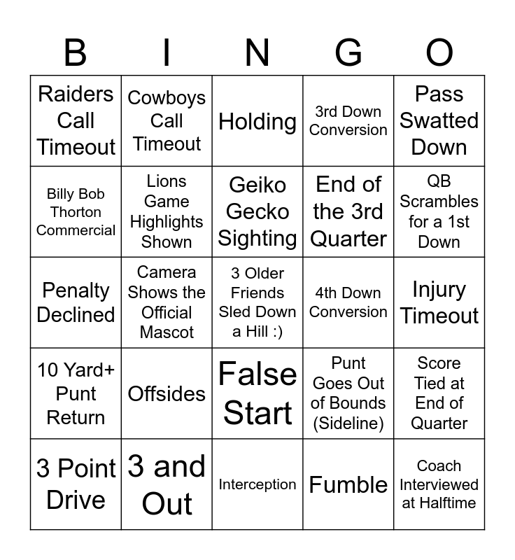 This bingo card has a free space and 45 words: Ruling Overturned, Coach Interviewed at Halftime, Missed Field Goal, 3 Point Drive, Touchdown Celebration, Fumble, Holding, Roughing the Quarterback, Pass Swatted Down, 3 and Out, 3rd Down Conversion, 4th Down Conversion, False Start, Offsides, Incomplete Pass, Interception, QB Sacked, Penalty Declined, Pass Interference, QB Scrambles for a 1st Down, Cowboys Call Timeout, Cowboys Touchdown, Raiders Touchdown, Raiders Call Timeout, Personal Foul, Injury Timeout, Play Reviewed, Challenge Flag Thrown, Punt Goes Out of Bounds (Sideline), 10 Yard+ Punt Return, Fair Catch Signaled, Score Tied at End of Quarter, Camera Shows an Ariel Shot of Stadium, Camera Shows a Celebrity in Attendance, Camera Shows a Fan in Full Face Paint, Camera Shows the Official Mascot, Camera Shows the Vegas Strip, Visit Las Vegas Commercial, Beer Commercial, Geiko Gecko Sighting, Billy Bob Thorton Commercial, End of the 3rd Quarter, Steelers Ejection Shown, Lions Game Highlights Shown and College Football Game/Playoff Promo.