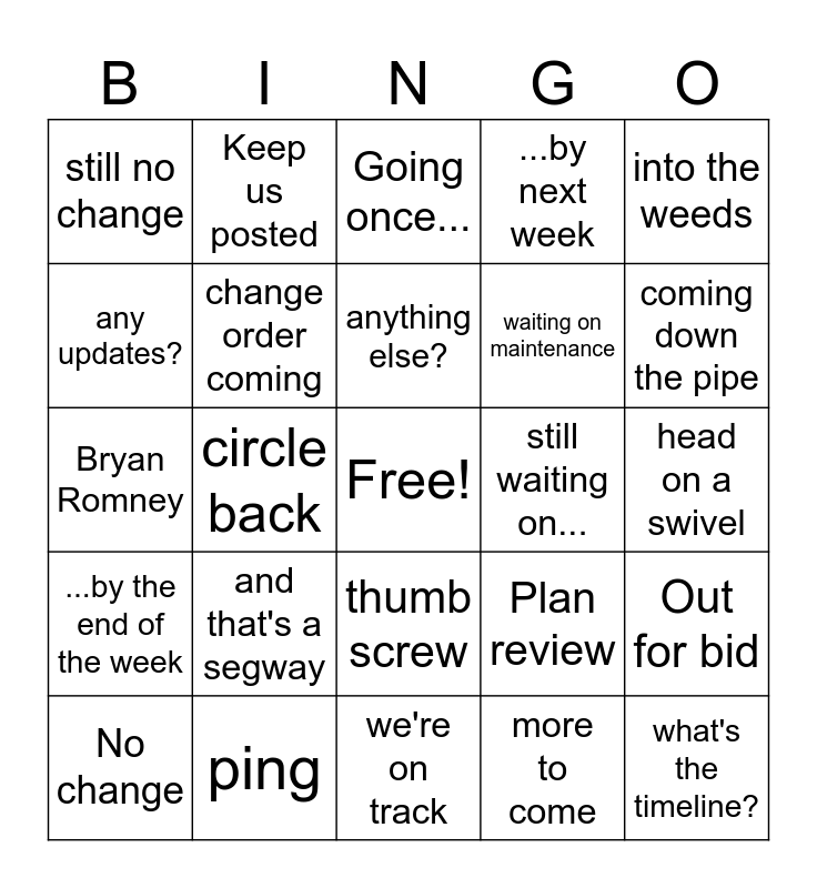This bingo card has a free space and 24 words: and that's a segway, ping, anything else?, No change, into the weeds, still no change, any updates?, Keep us posted, still waiting on..., thumb screw, waiting on maintenance, Bryan Romney, Plan review, Out for bid, change order coming, more to come, head on a swivel, Going once..., coming down the pipe, circle back, what's the timeline?, ...by the end of the week, ...by next week and we're on track.